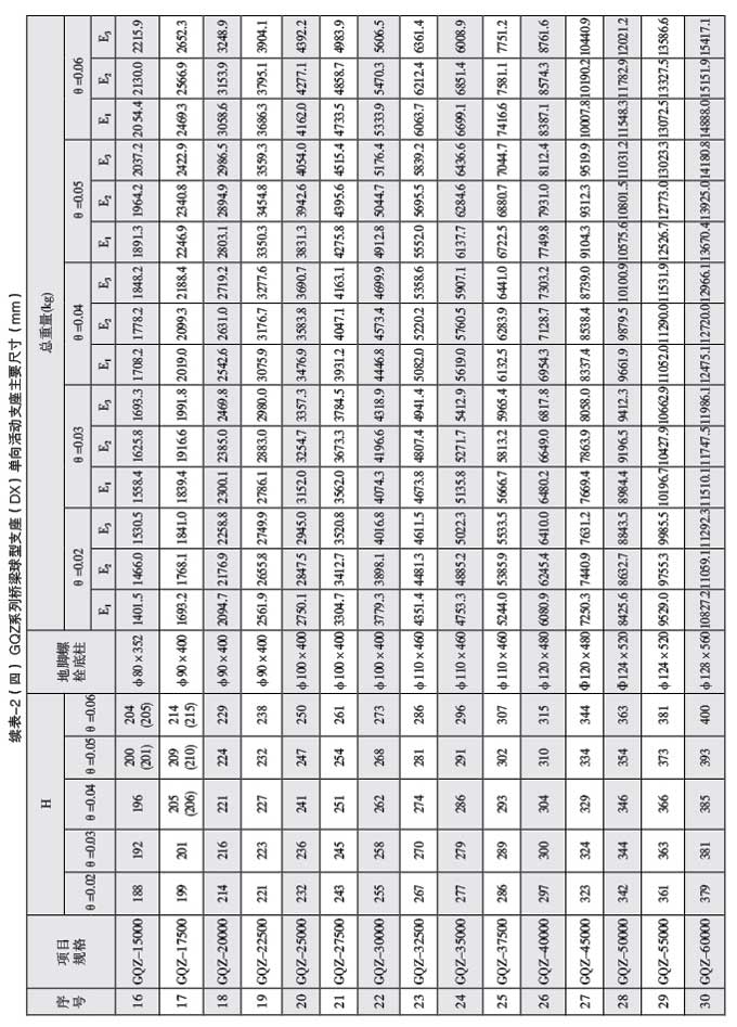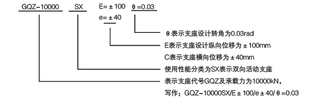 橫向位移:SX(雙向活動支座),1000~9000kN, e=±20mm, 10000~60000kN, e=±40mm DX(單向活動支座)e=±3mm,支座縱向、橫向位移量還可根據(jù)實際需要進行調(diào)整。